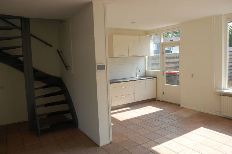 De begane grond bestaat uit een lichte doorzon woonkamer met een open keuken. De keuken is voorzien van een gaskookplaat en afzuigkap en beschikt over een vaatwasser aansluiting. Vanuit de keuken is de tuin bereikbaar. De tuin ligt op het Zuidoosten en heeft een achteruitgang. Het toilet zit in het halletje bij de voordeur. De berging is bereikbaar vanuit het halletje en vanaf buiten. De trap naar de 1e verdieping zit in de woonkamer.